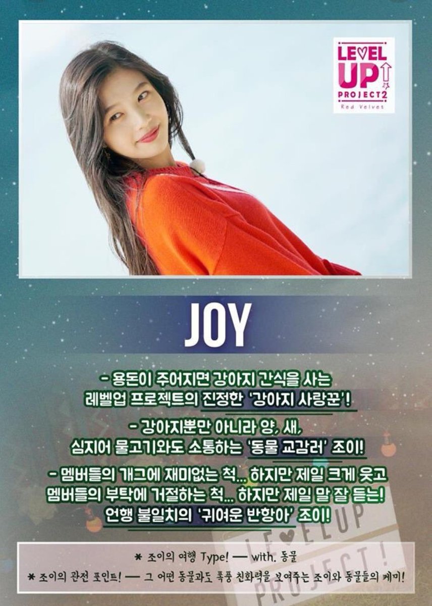 Joy es la más alta del grupo, y su aura madura es atractiva. La diferencia entre su personalidad cool, amable y sus expresiones frías han estado atrayendo a muchos fans. Además de ser una cantante top de Corea, ella a filmado dramas con el papel principal. Hemos hecho algunas preguntas a Joy quien está ampliando sus actividades en la actuación.